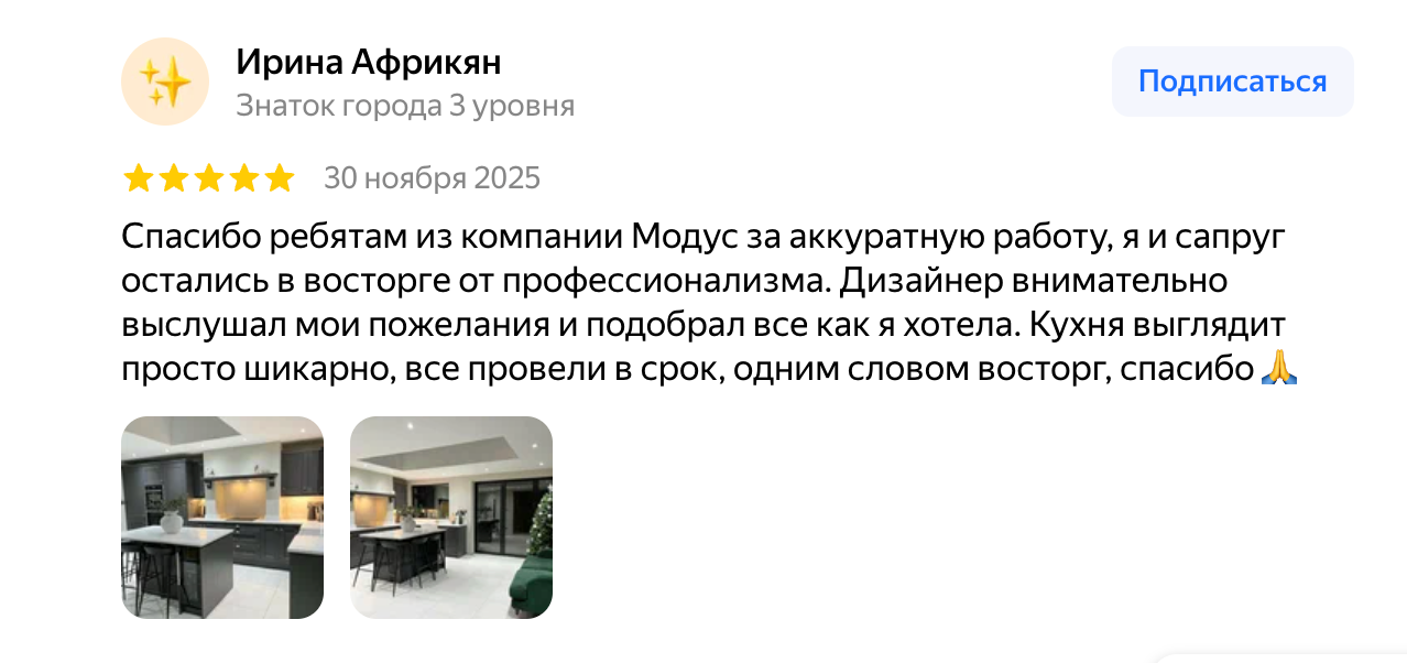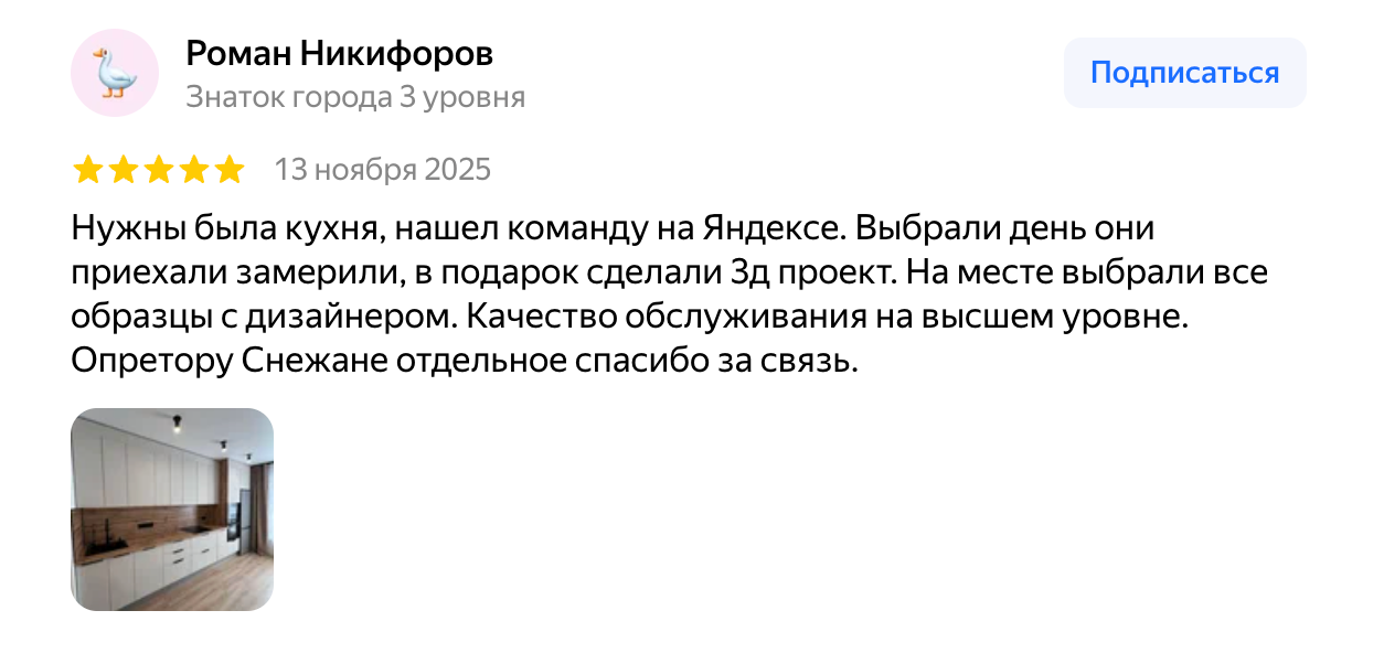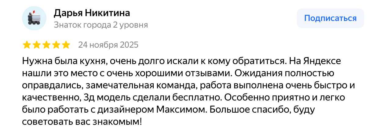 Через 14-30 дней вы получите полностью готовую угловую кухню, подходяющую под ваши задачи и привычки, которая прослужит более 30 лет
